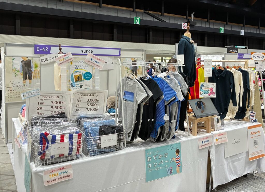 本展示では、「肌着ではない、おでかけロンパース」というコンセプトのもと、110〜140cmまで展開するロンパースを実際にご覧いただきました。素材や縫製、着用時のシルエットなど、オンラインでは伝えきれない部分を直接お伝えできたことは、大変貴重な機会となりました。