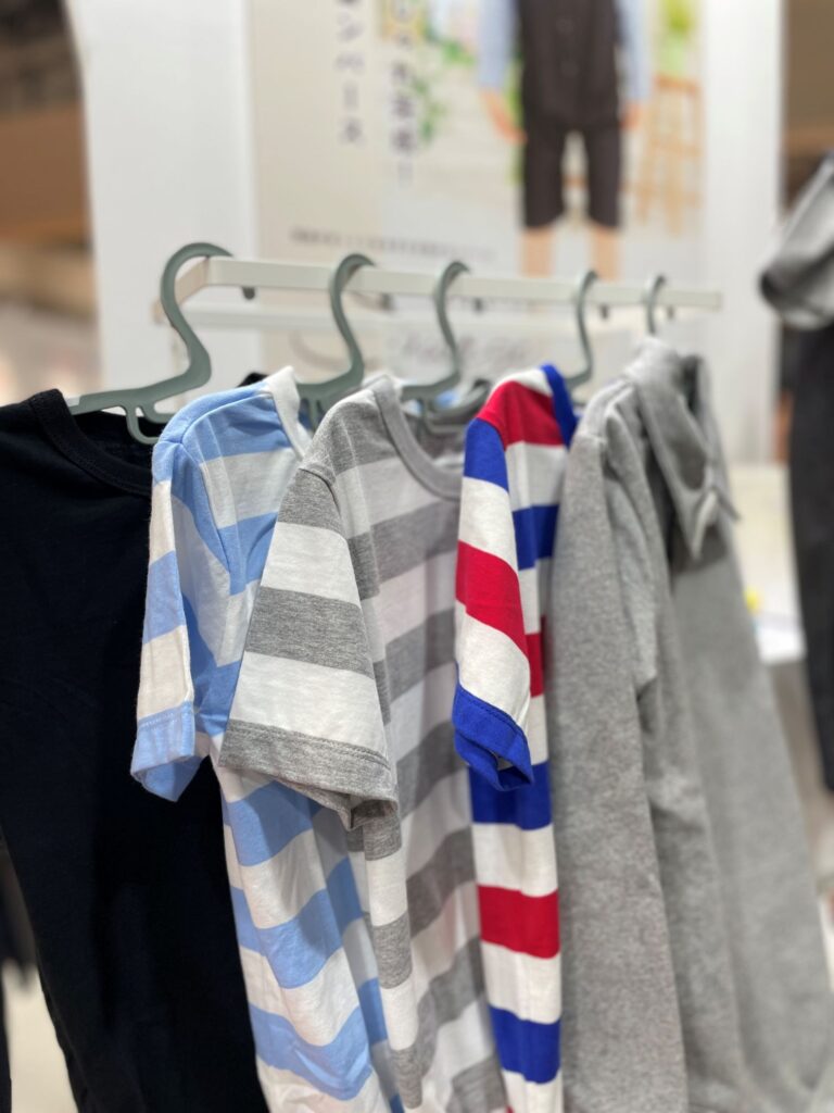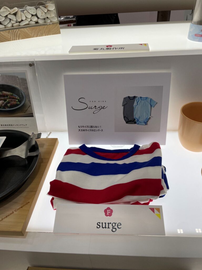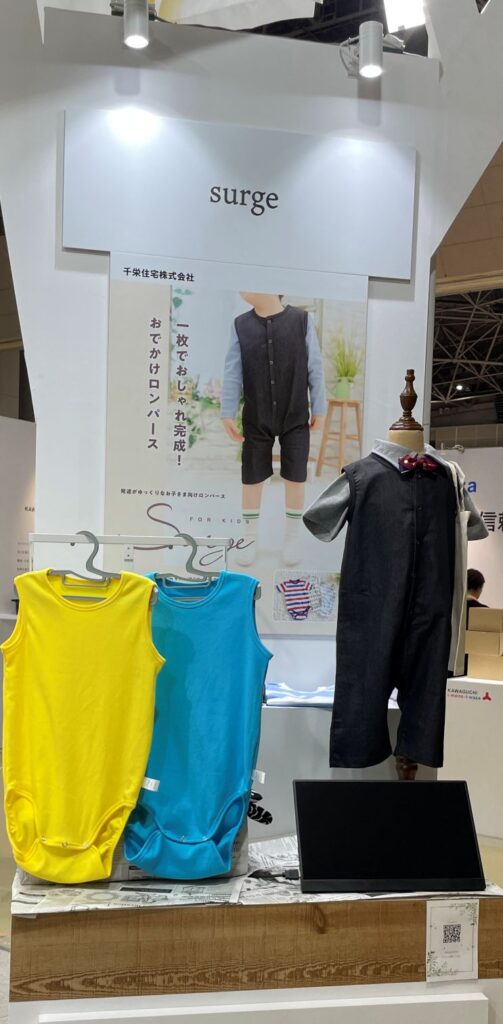 surge の展示スペースでは、100cm 以上の大きめサイズのロンパースや、肌にやさしい素材を使った新作ラインを中心に展開しました。触って確かめられるように素材見本を用意し、縫製や着心地を体感いただける工夫を凝らしました。